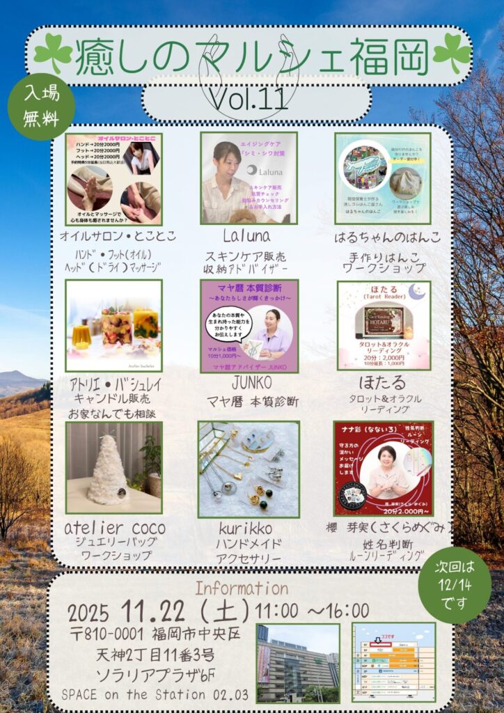 | 10/19 | 癒しのマルシェ福岡 Vol.10 | 天神西茂ビル5F |
